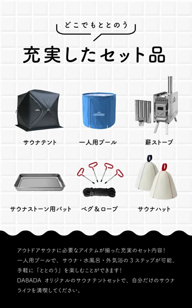 自分だけのサ活空間を作れて、ロウリュ・水風呂・ととのう体験まで楽しめる本格ポータブルサウナです。キャンプにも庭にも対応し、サウナ好きにはたまらないギアと言えます。