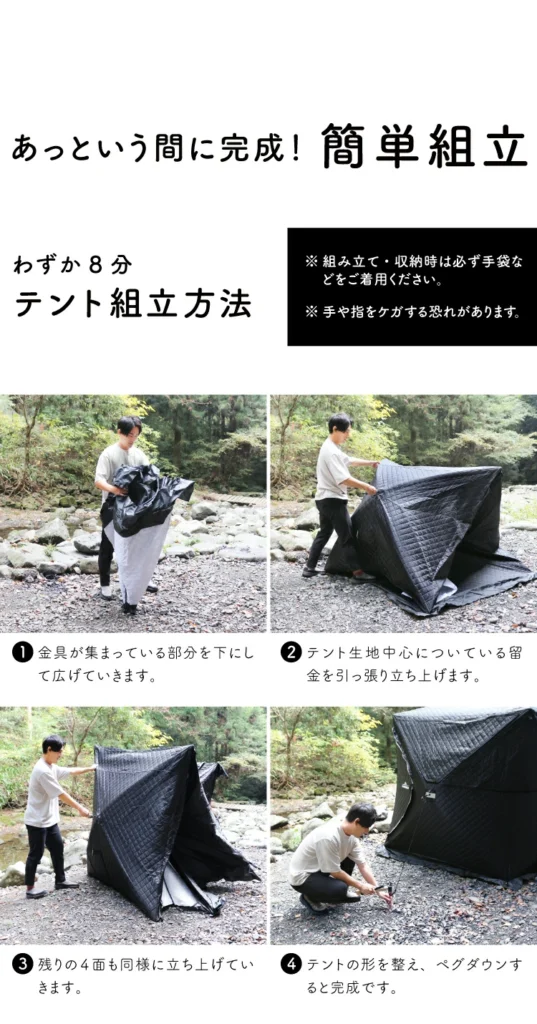 - 薪ストーブは高温になるので火の扱いに注意する必要あり。テント内外の安全距離を十分に確保しましょう。