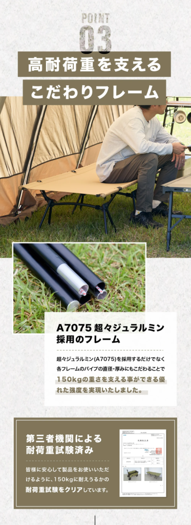 軽量設計(約3.2kg)でありながら、丈夫さもしっかり確保されているため、ファミリーキャンプでも快適に使えるベーシックなコットとして人気です。