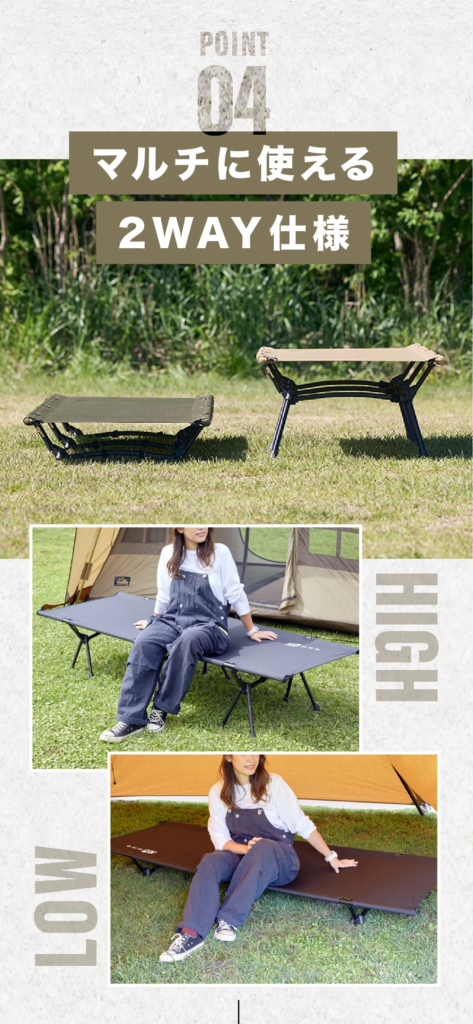 例えば、**camdoor 2WAYキャンプコット**や ZUKK 2WAY コット のようなリーズナブル系もあります。