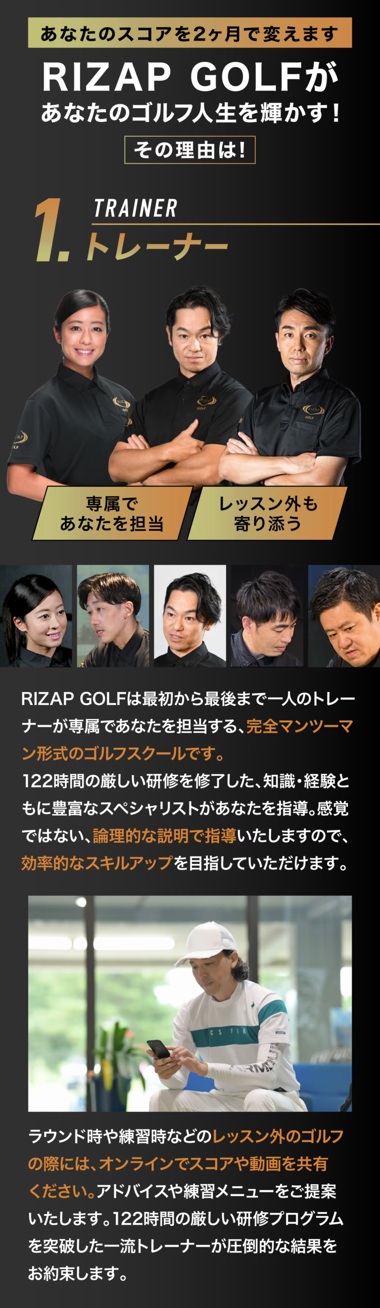 専属トレーナーによる完全マンツーマン指導と科学的なスイング分析で、短期間でもスコアアップを目指せるのが大きな特徴です。