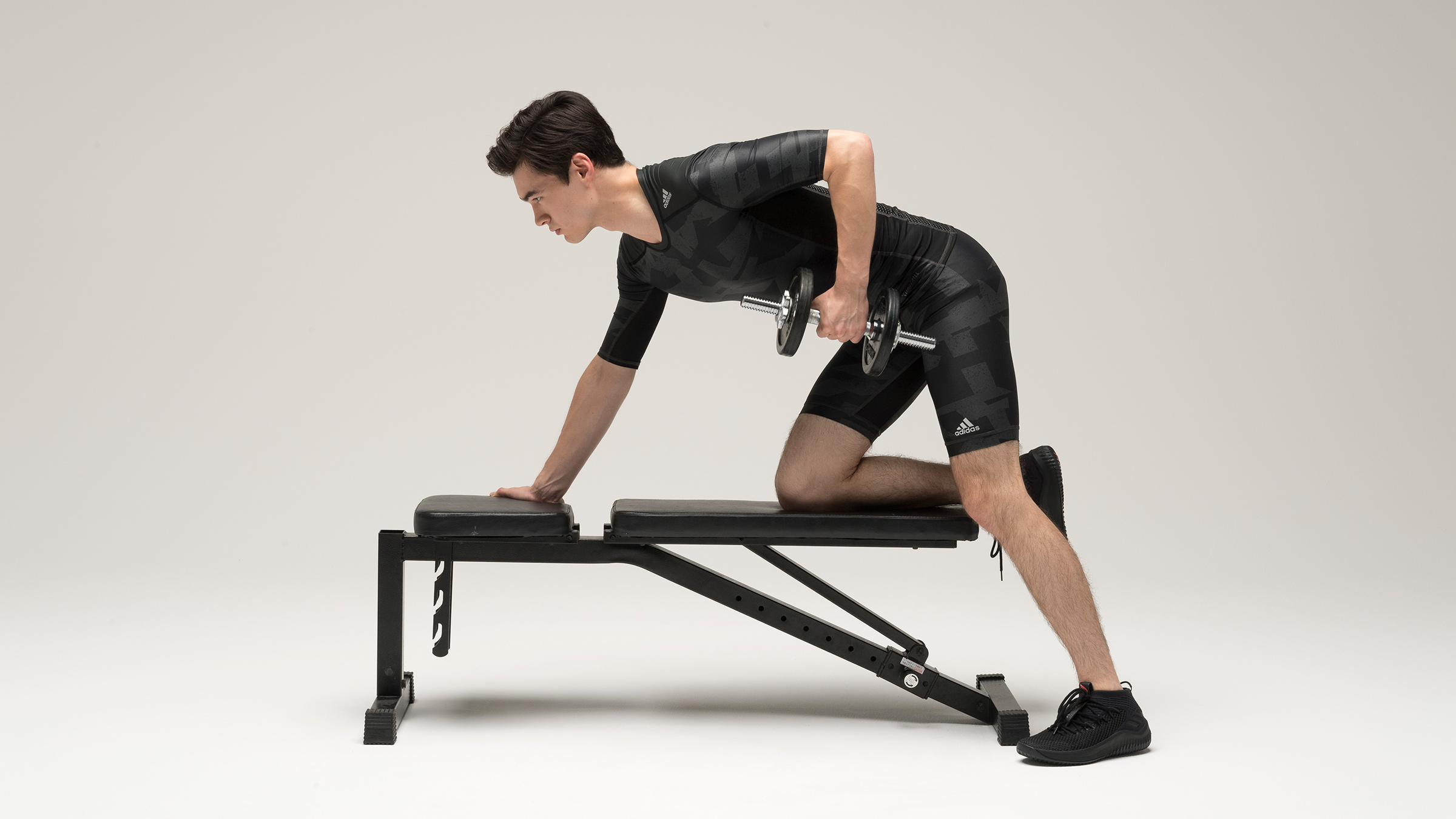 • 前傾姿勢でダンベルを持つ
